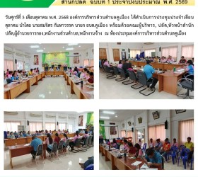 วันศุกร์ที่ 29 เดือนสิงหาคม พ.ศ. 2568 องค์การบริหารส่วนตำบลคูเมือง ได้ดำเนินการประชุมประจำเดือนสิงหาคม นำโดยคณะผู้บริหาร พร้อมด้วยปลัด,หัวหน้าสำนักปลัด,ผู้อำนวยการกอง,พนักงานส่วนตำบล,พนักงานจ้าง ณ ห้องประชุมสภาองค์การบริหารส่วนตำบลคูเมือง