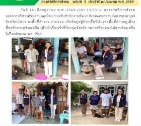วันที่ 16 เดือนตุลาคม พ.ศ. 2568 เวลา 13.30 น. กองสวัสดิการสังคม องค์การบริหารส่วนตำบลคูเมือง ร่วมกับสำนักงานพัฒนาสังคมและความมั่นคงของมนุษย์จังหวัดยโสธร ลงพื้นที่สำรวจ รวบรวม เก็บข้อมูลผู้ป่วยเรื้อรังในเขตพื้นที่ตำบลคูเมือง ที่ขอรับความช่วยเหลือ เพื่อนำเรื่องเข้าที่ประชุมจังหวัด รอการพิจารณาให้การช่..... วันที่ 16 ต.ค. 2568 (ดูู 10) |