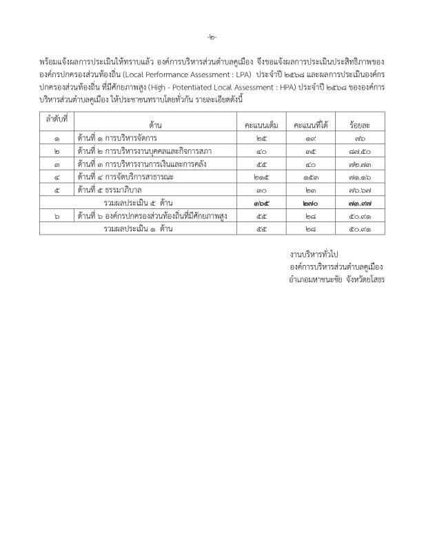 ผลการประเมินประสิทธิภาพขององค์การบริหารส่วนตำบลคูเมือง ประจำปี 2568